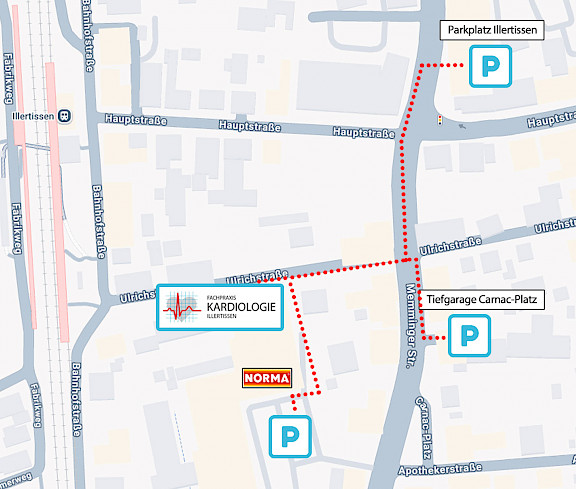 Für Patienten stehen in der Umgebung mehrere Parkmöglichkeiten zur Verfügung, z. B. am Norma-Markt, in der Tiefgarage am Carnac-Platz oder auf dem Parkplatz Illertissen.